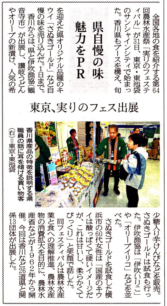 10月31日(金)~11月1日(土)まで東京・東池袋サンシャインシティワールド インポートマートビル4階展示ホールAにおいて第64回農林水産祭「実りのフェスティバル」が開催され、香川県ブースで「希少糖芋けんぴ」が販売されています。